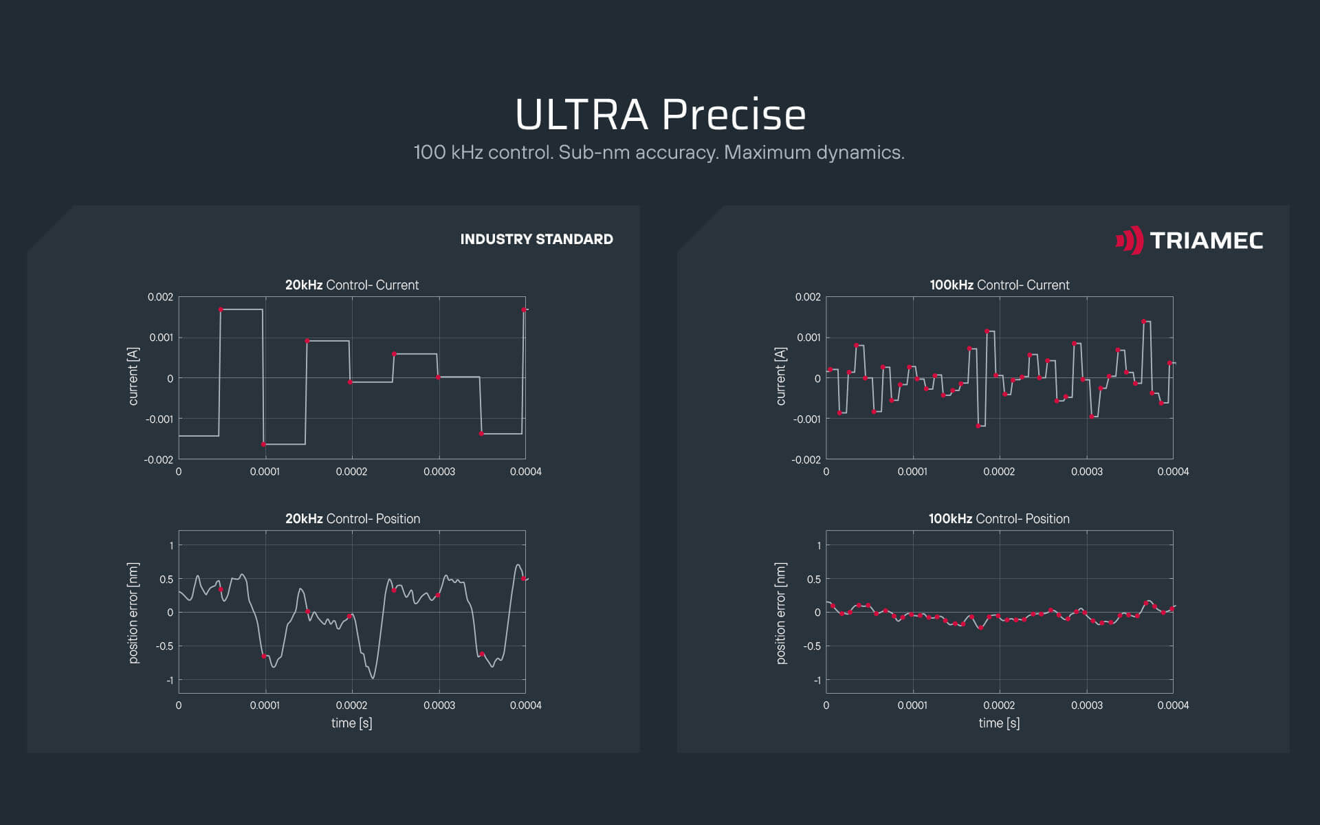Triamec develops servo drives that outperform the best competitors in independent tests for positioning speed and precision. Customers in ultra-precision manufacturing achieve standstill noise in the subatomic range and surface finishes of Ra < 0.2 nm – equivalent to ±1 atom. In semiconductor inspection, machines with Triamec servo drives execute 5 mm steps into a ±50 nm window in under 30 ms at 50 m/s² with 6 kg moving mass.