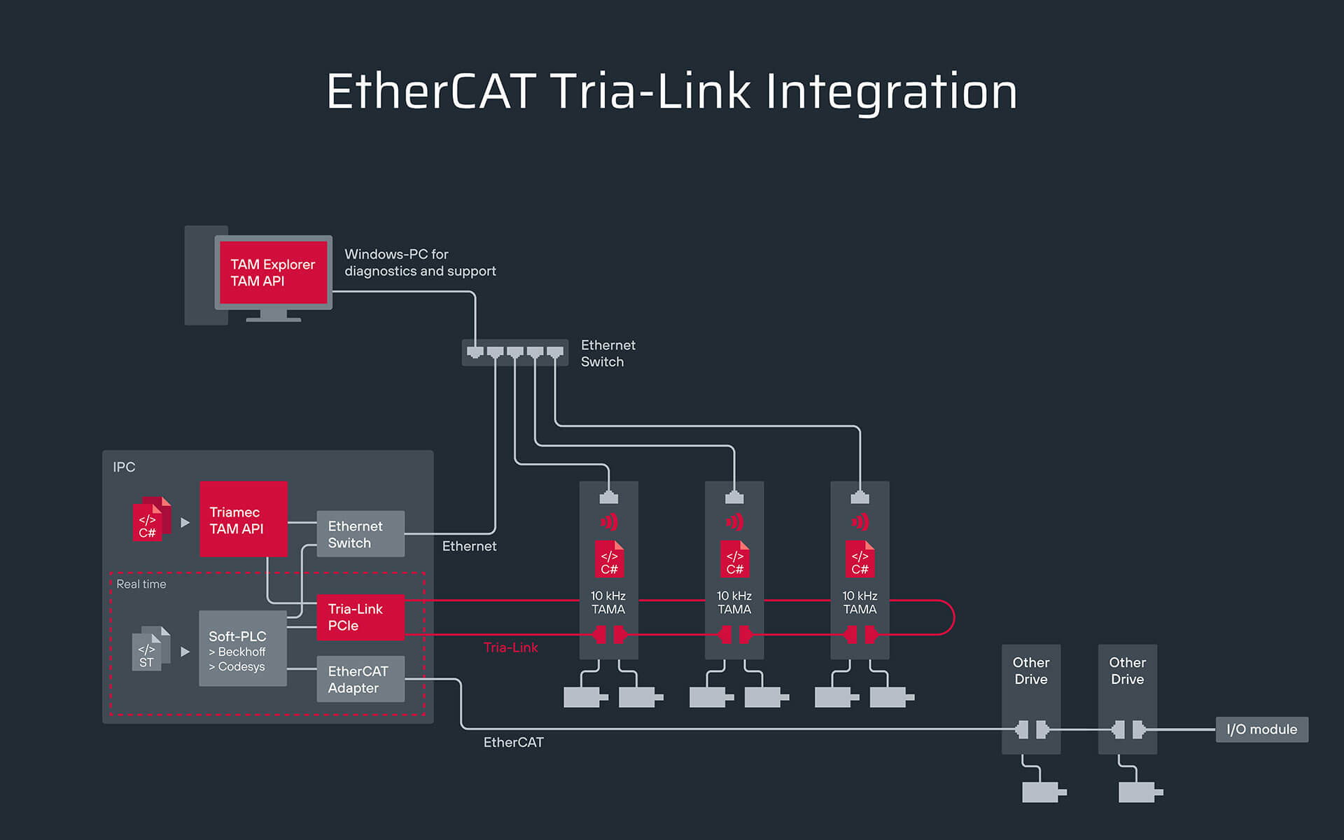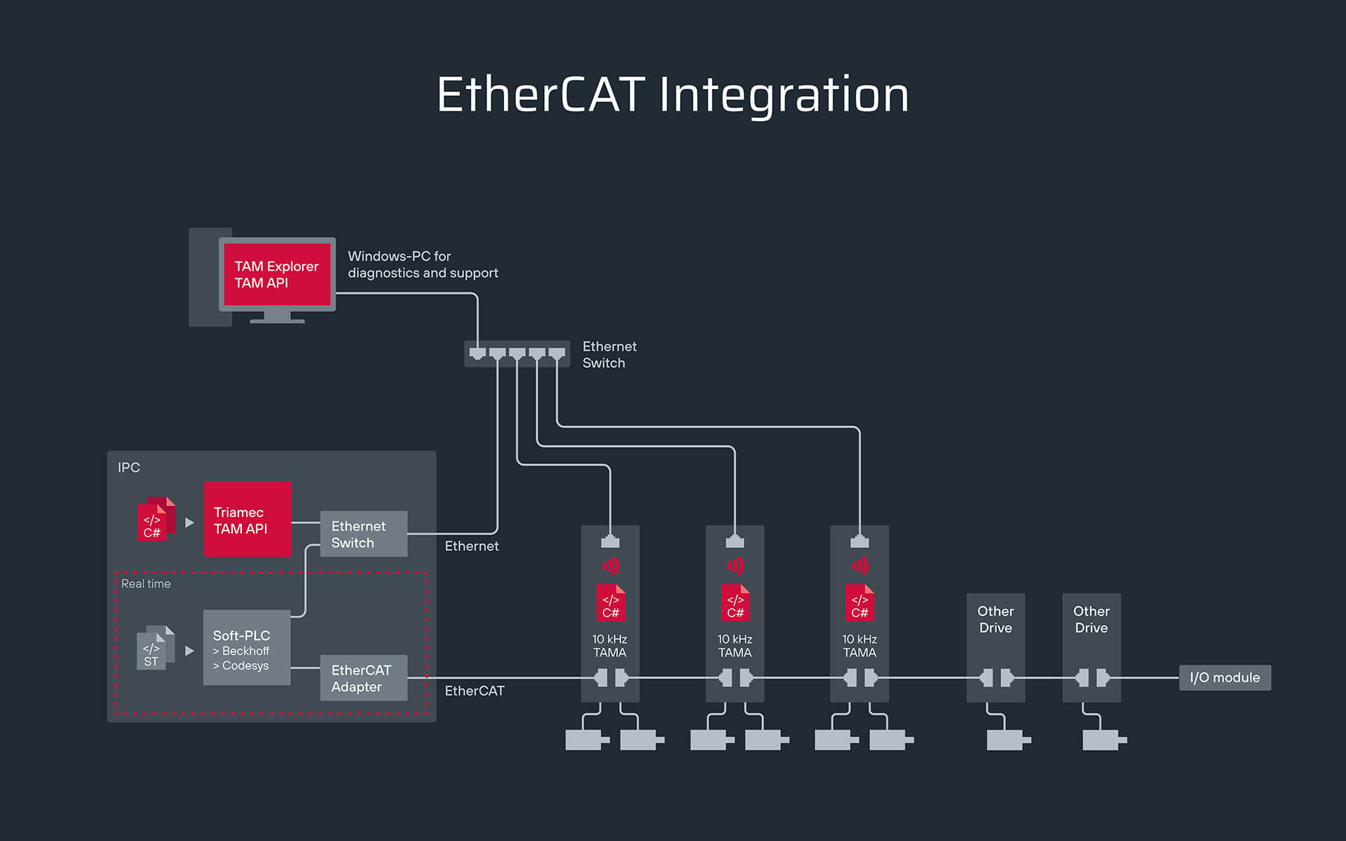 Both series support EtherCAT and Tria-Link fieldbus connectivity, with the option for standalone operation without fieldbus. Commissioning and optimization are performed through auxiliary Ethernet and USB connections, separate from the fieldbus, using TAM System Explorer software for real-time register access at up to 100 kHz sampling rate.